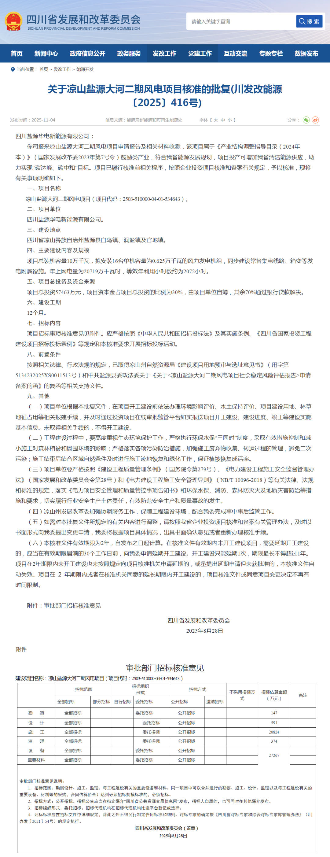 凉山盐源凉风坳二期风电项目位于四川省凉山彝族自治州盐源县棉桠镇、梅雨镇,项目单位为四川盐源华电新能源有限公司,项目总装机容量4万千瓦,拟安装8台单机容量为0.5万千瓦的风力发电机组,同步建设常备集电线路、箱变等发电附属设施。在已建凉风坳220千伏升压站内扩建一台主变,通过既有220千伏线路送出。年上网电量为8985.72万千瓦时,等效年利用小时数约为2246小时。项目总投资27538万元。