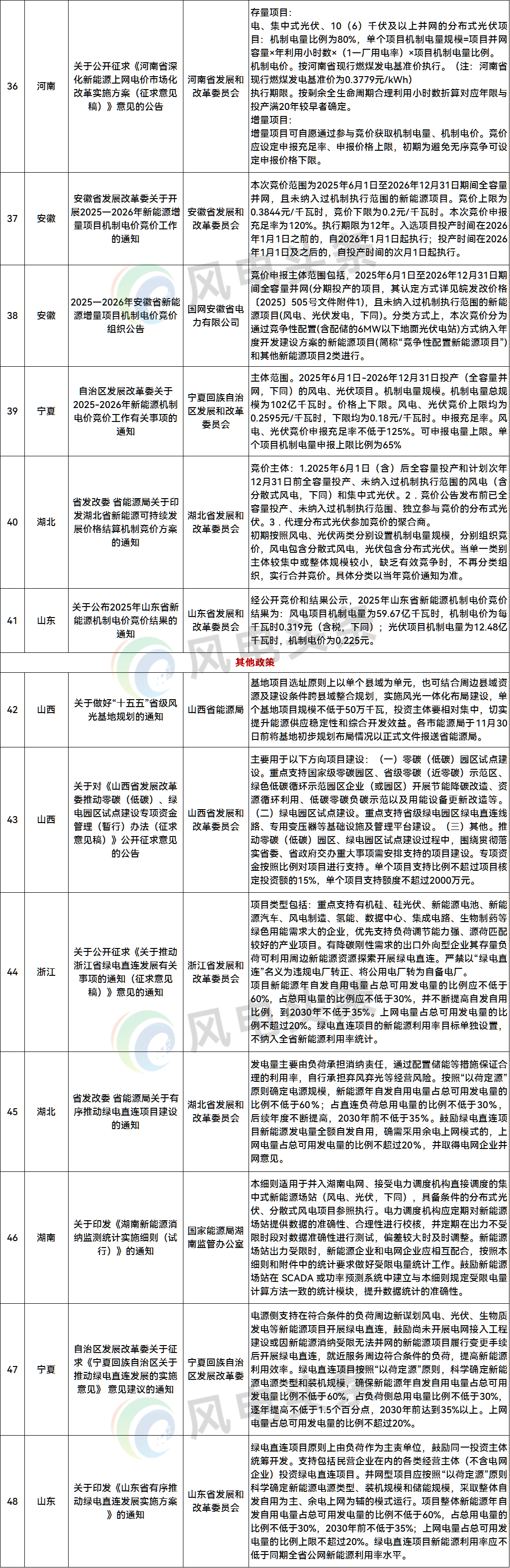 山西、浙江、湖北等6个地方下发相关文件。山西发布做好“十五五”省级风光基地规划;浙江、湖北、宁夏、山东发布“绿电直连”相关政策;湖南发布新能源消纳监测统计实施细则(试行)。