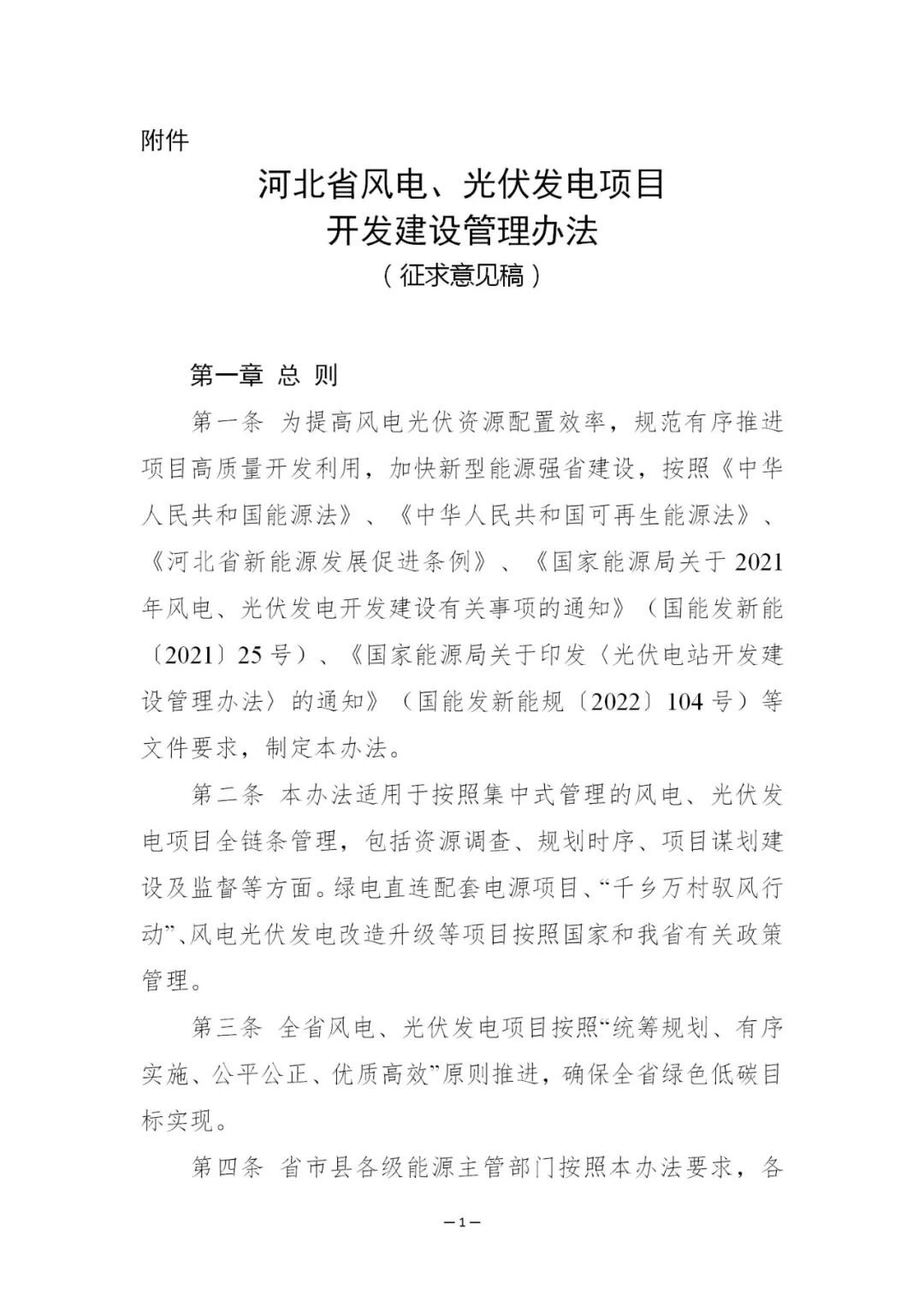 为促进我省风电、光伏发电健康可持续发展,加快新型能源强省建设,我委起草了《河北省风电、光伏发电项目开发建设管理办法》,现将征求意见稿予以公告,向社会公开征求意见。欢迎各界人士结合风电光伏发电行业发展、《反垄断法》、《公平竞争审查条例》、《公平竞争审查条例实施办法》以及合法性合理性等内容,积极提出意见建议。