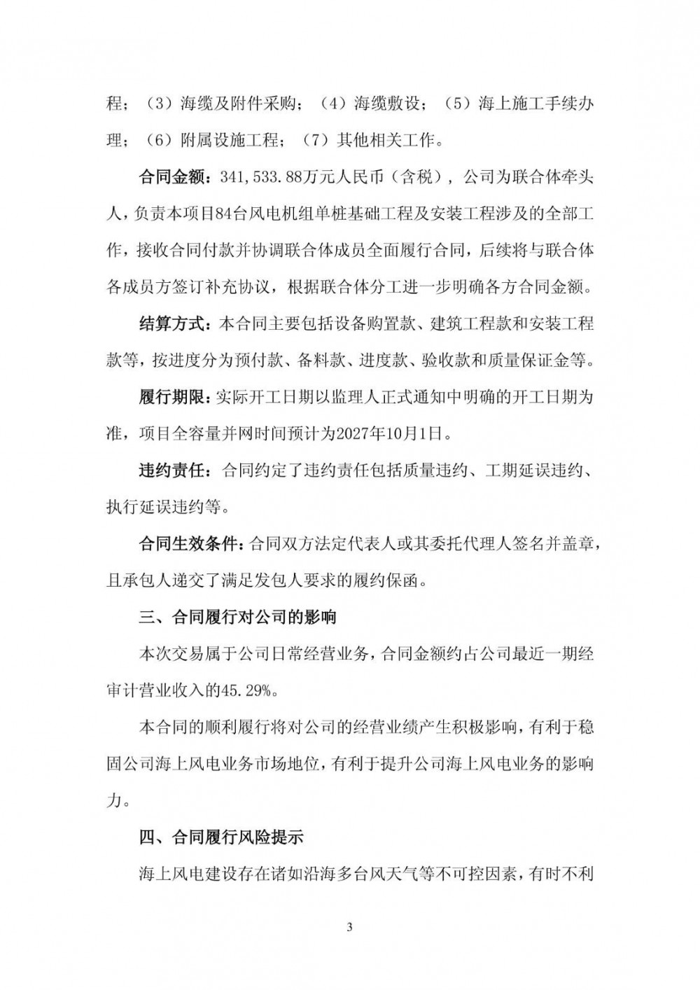 合同金额:341,533.88万元人民币(含税), 华电科工为联合体牵头人,负责本项目84台风电机组单桩基础工程及安装工程涉及的全部工作,接收合同付款并协调联合体成员全面履行合同,后续将与联合体各成员方签订补充协议,根据联合体分工进一步明确各方合同金额。