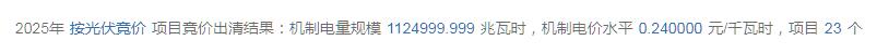 根据结果公示,首批风电竞价出清价格为0.24元/千瓦时,项目4个,机制电量规模5.43亿千瓦时;光伏竞价出清价格为0.24元/千瓦时,项目23个,机制电量规模11.25亿千瓦时。