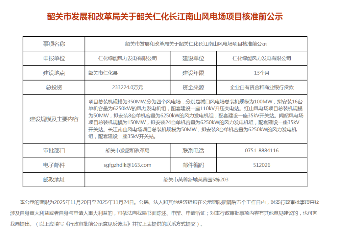 韶关仁化长江南山风电场项目建设单位为仁化绿能风力发电有限公司,建设地点位于韶关市仁化县,总投资233224.0万元,建设年限13个月。项目总装机规模为350MW,分为四个风电场,分别是城口风电场总装机规模为100MW,拟安装16台单机容量为6250kW的风力发电机组,配套建设一座110kV升压变电站。红山风电场项目总装机规模为50MW,拟安装8台单机容量为6250kW的风力发电机组,配套建设一座35kV开关站。闻韶风电场项目总装机规模为150MW,拟安装24台单机容量为6250kW的风力发电机组,配套建设一座35kV开关站。长江南山风电场项目总装机规模为50MW,拟安装8台单机容量为6250kW的风力发电机组,配套建设一座35kV开关站。