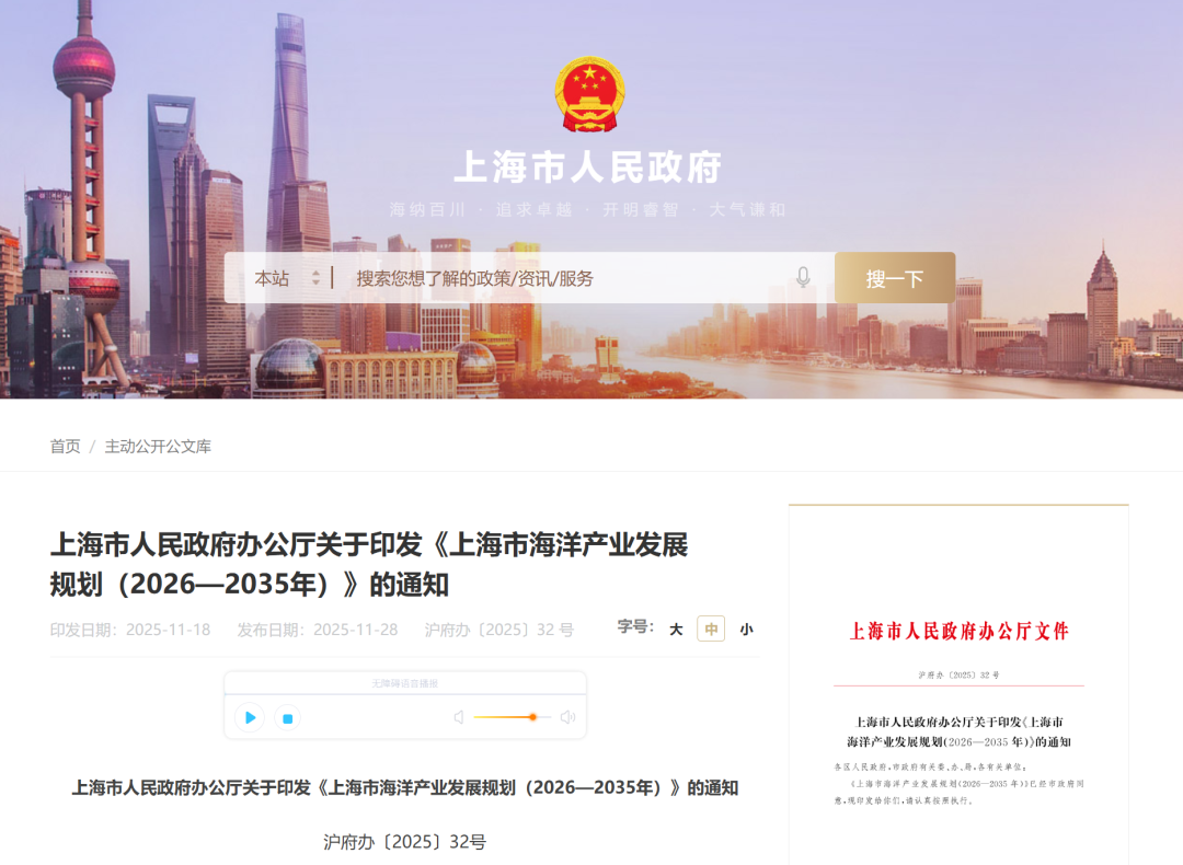 新能源圈获悉,11月28日,上海市人民政府办公厅发布关于印发《上海市海洋产业发展规划(2026—2035年)》的通知。