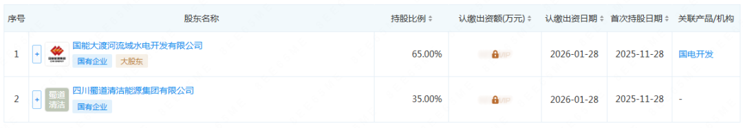 企查查股权穿透显示,该公司由国能大渡河流域水电开发有限公司、四川蜀道清洁能源集团有限公司共同持股。