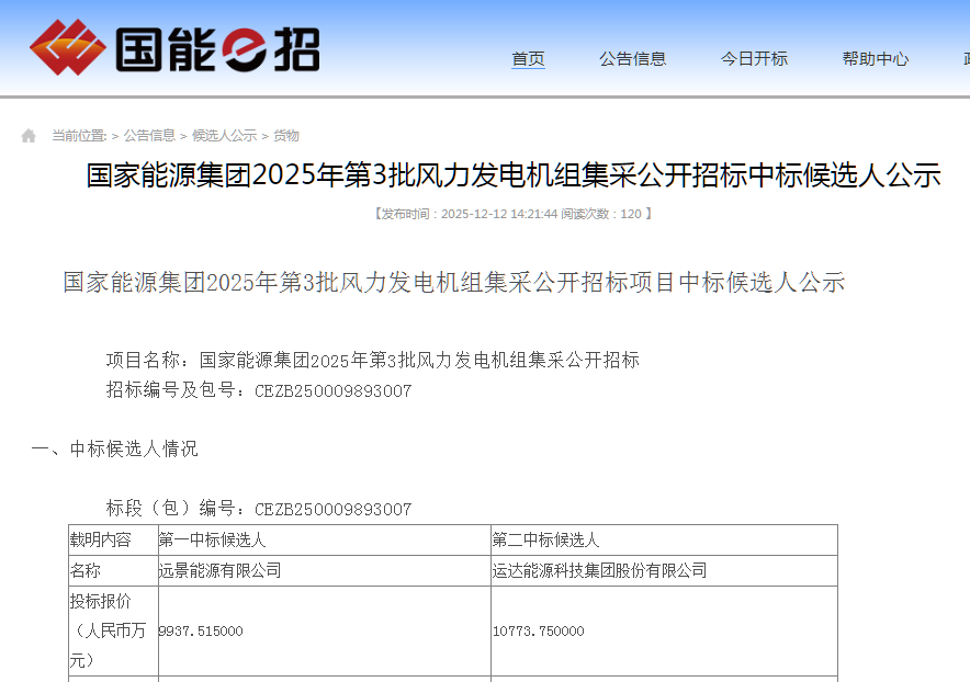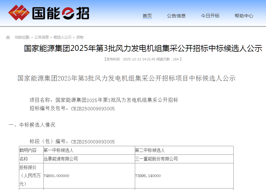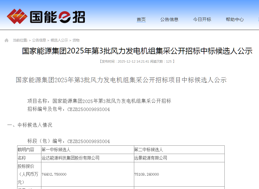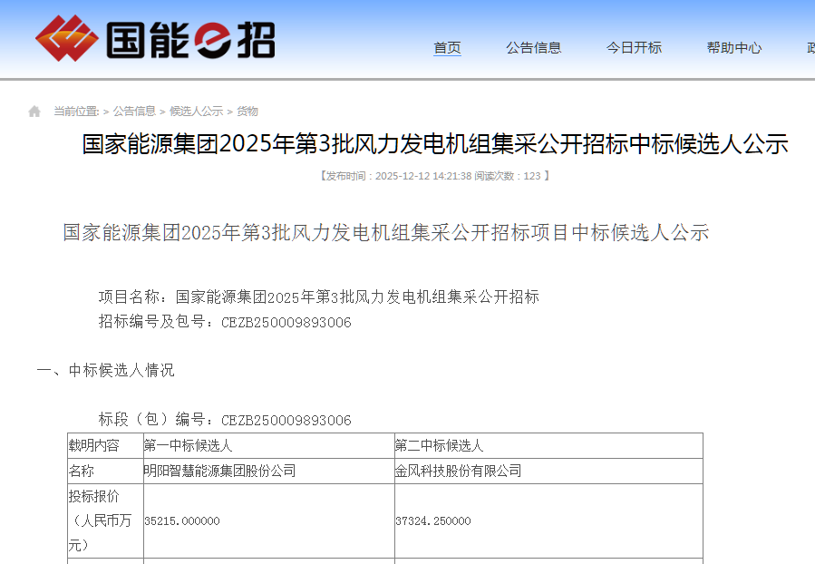 新能源圈获悉,12月12日,国家能源集团2025年第3批风力发电机组集采公开招标中标候选人公示。