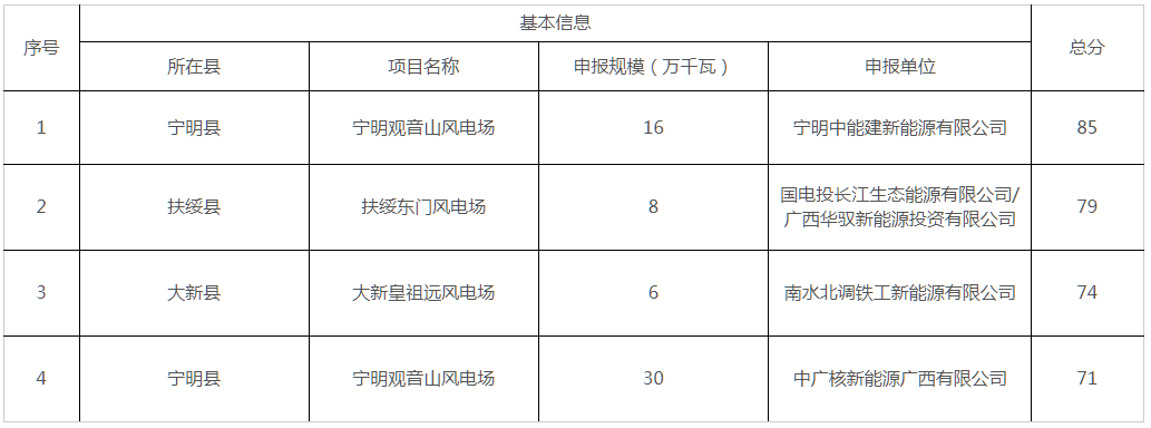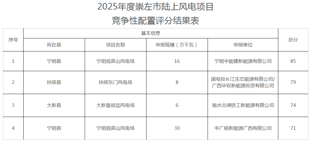 2025年度崇左市陆上风电项目竞争性配置评分结果表