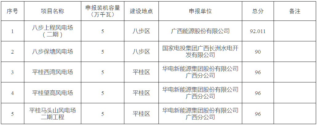 贺州市2025年陆上风电项目竞争性配置评分结果表
