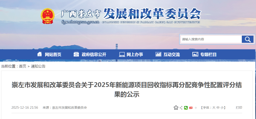 崇左市发展和改革委员会关于2025年新能源项目回收指标再分配竞争性配置评分结果的公示