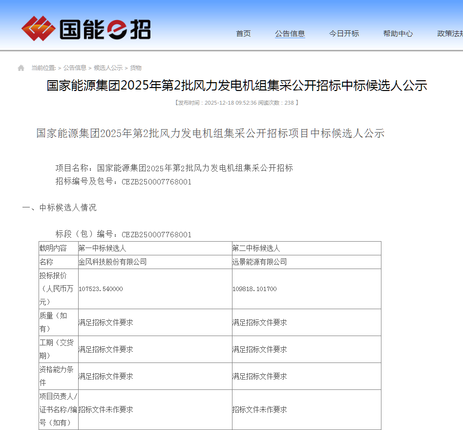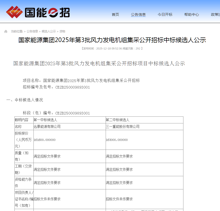 新能源圈获悉,12月17日、18日,国家能源集团2025年第3批风力发电机组集采-标包一、国家能源集团2025年第2批风力发电机组集采-标包一、中广核新能源宁夏固原市原州区27.50MW陆上分散式风电项目风力发电机组采购中标候选人公示,规模合计1577.5MW。
