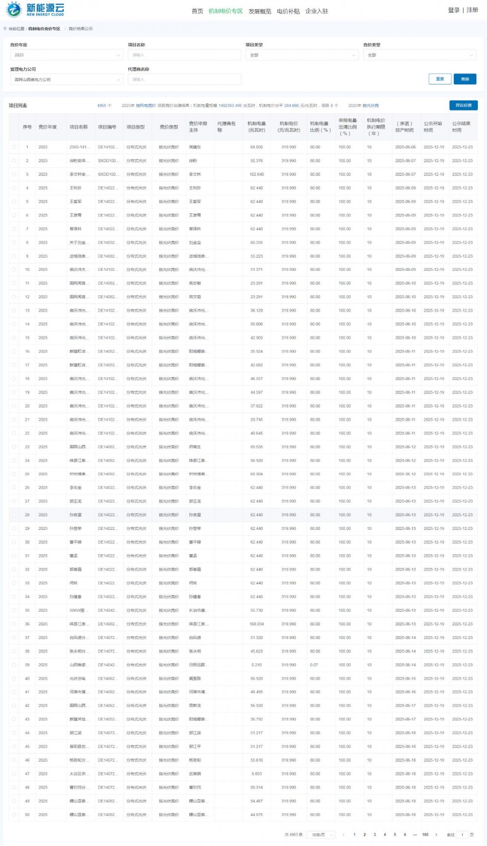 根据公示,2025年按光伏竞价:机制电量规模39.75亿千瓦时,电价319.99元/兆瓦时,项目4955个。