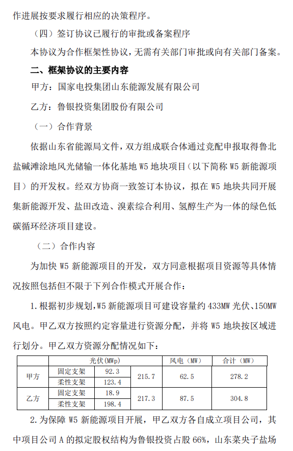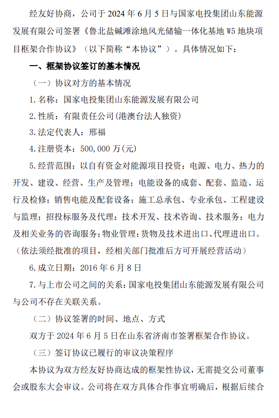 2024-04-30 6月5日,鲁银投资与国家电投集团山东能源发展有限公司签署《鲁北盐碱滩涂地风光储输一体化基地W5地块项目框架合作协议》。