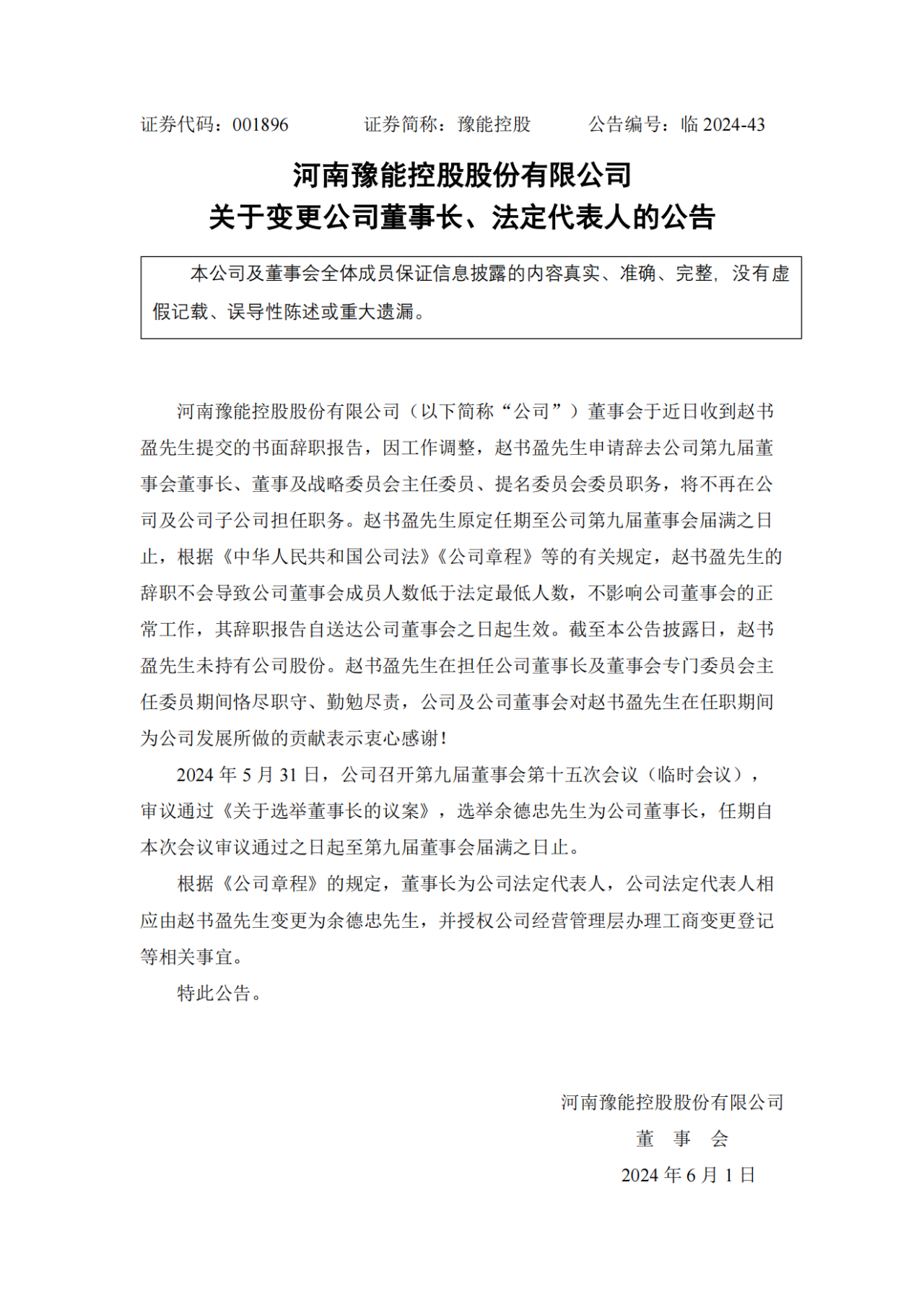根据豫能控股《关于变更公司董事长、法定代表人的公告》,董事会于近日收到赵书盈提交的书面辞职报告,因工作调整,赵书盈申请辞去公司第九届董事会董事长、董事及战略委员会主任委员、提名委员会委员职务,将不再在公司及公司子公司担任职务。