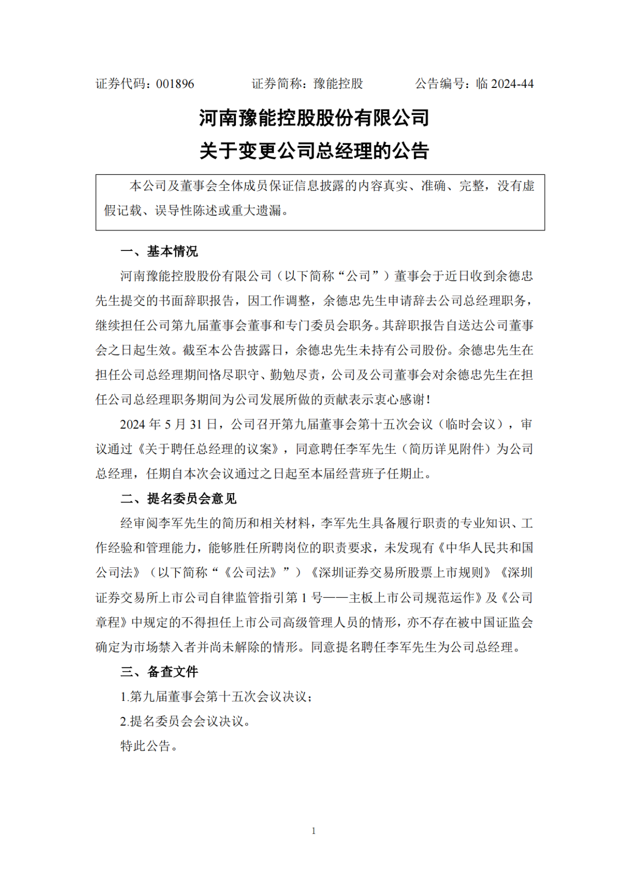 2024-04-30 近日,豫能控股公布《关于变更公司董事长、法定代表人的公告》《关于补选第九届董事会董事的公告》《关于变更公司总经理的公告》。