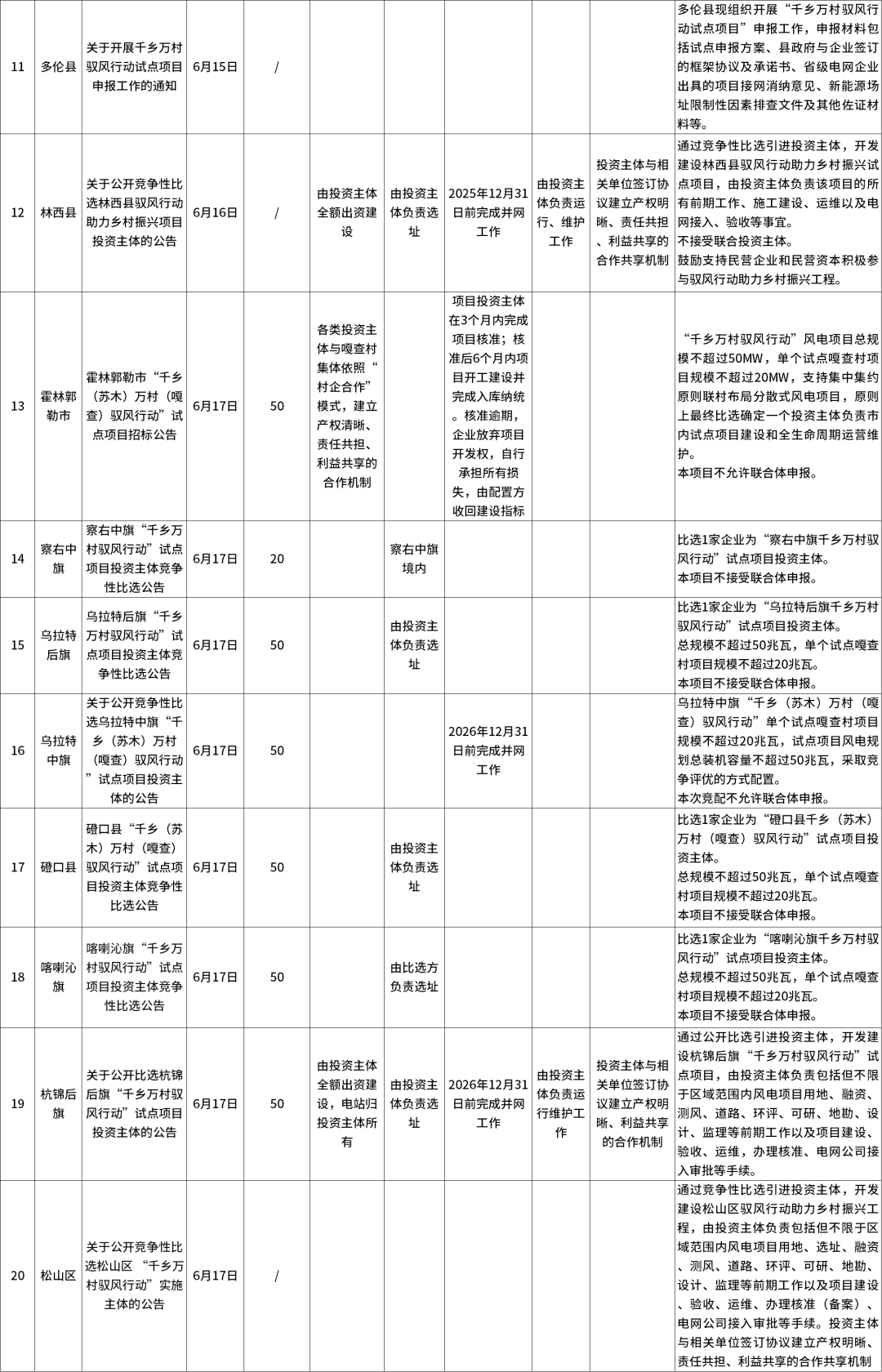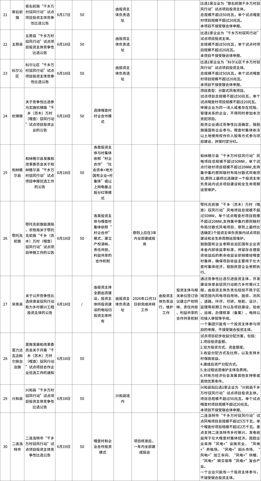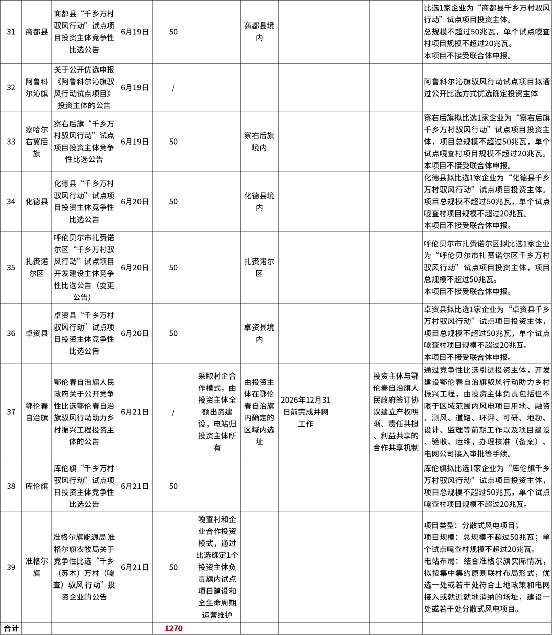 据悉,近期,内蒙古多地启动“千乡万村驭风行动”试点项目申报及投资主体竞争性比选,通过梳理,截至目前,累计有39个地方启动驭风行动试点项目,项目规模总计1270MW。