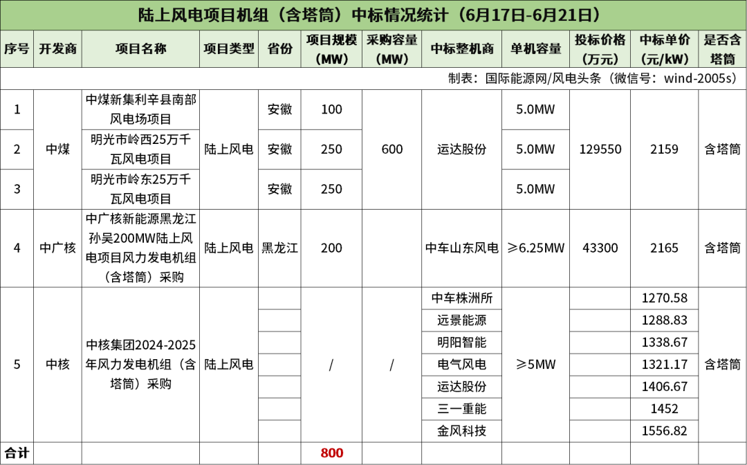 陆上风电:含塔筒最低中标单价1270.58元/kW,最高中标单价2165元/kW;不含塔筒最低中标单价900元/kW,最高中标单价1552元/kW。