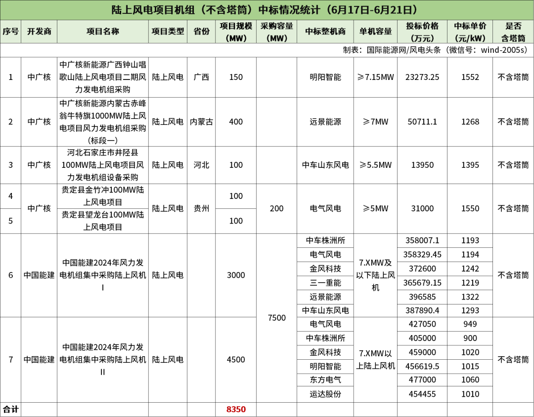 据统计,本周陆上风电不含塔筒项目共计6个,规模总计8350MW,项目中标均价为1199元/kW。