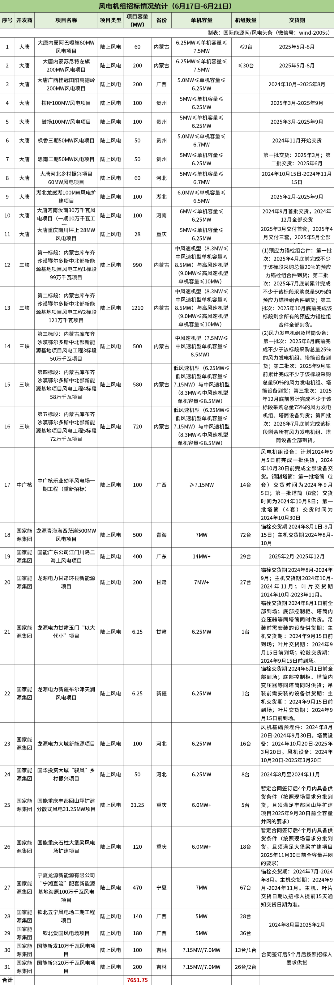 统计,本周风机招标市场方面,共有31个风电项目、7651.75MW风机启动采购,开发商是大唐、三峡、中广核、国家能源集团4家。