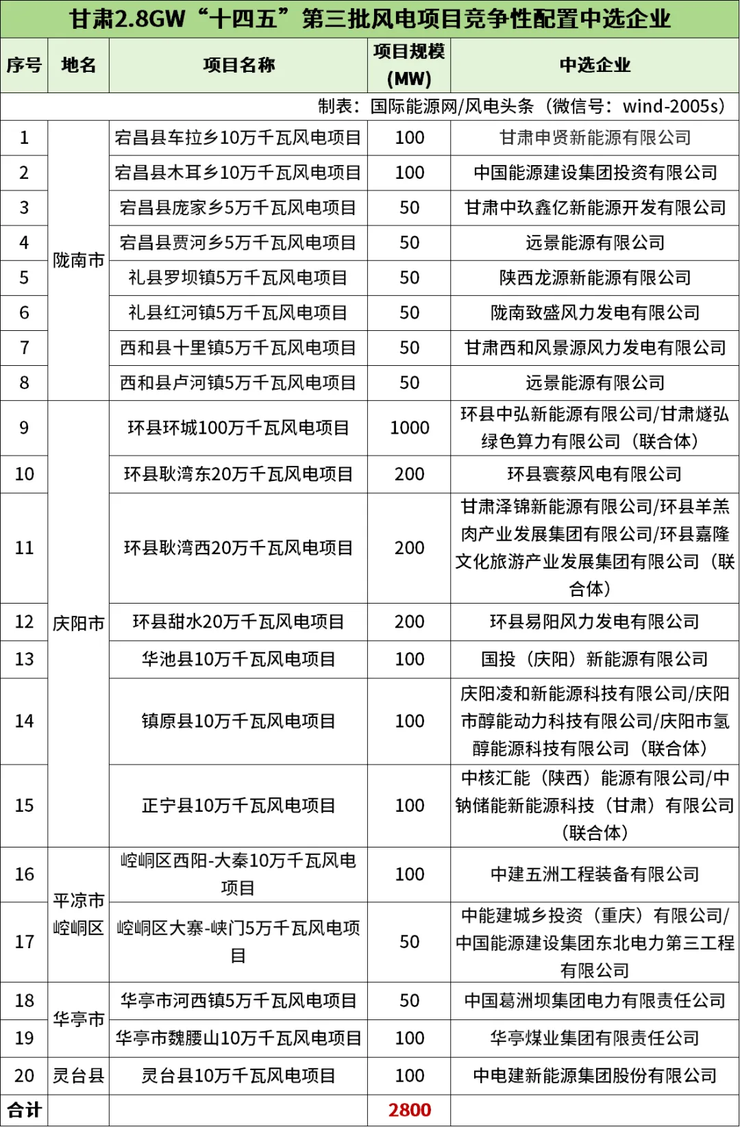 据还通过梳理,截至目前,陇南市、庆阳市、平凉市崆峒区、华亭市、灵台县“十四五”第三批新能源项目竞争性配置中选企业公示,共计20个风电项目,规模总计2800MW,25家企业中选。