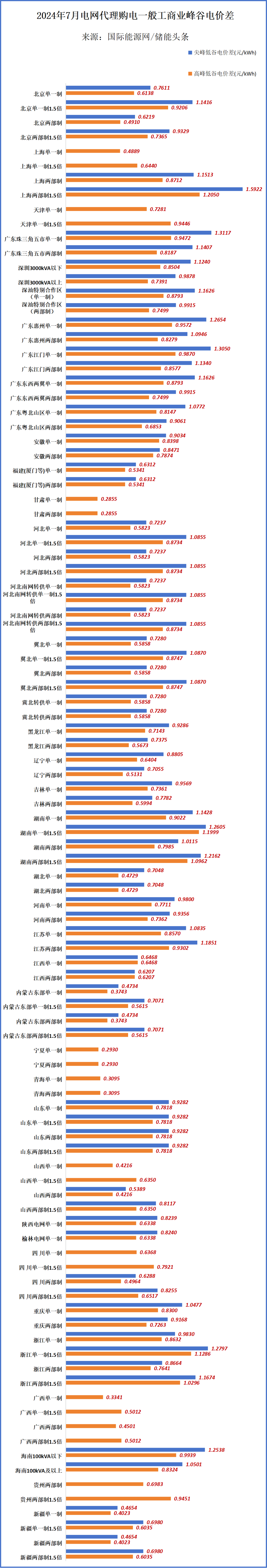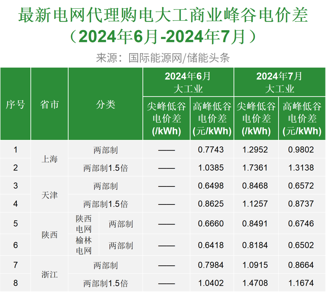 了解到,2024年7月电网代理购电价格中,全国峰谷价差最高的是上海,执行大工商业两部制1.5倍尖峰电价时,峰谷价差为1.7361元/kWh,比6月最高价格低0.42元/kWh。
