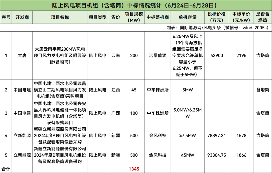 据统计,本周陆上风电含塔筒项目共计5个,规模总计1345MW,项目中标均价为1880元/kW。