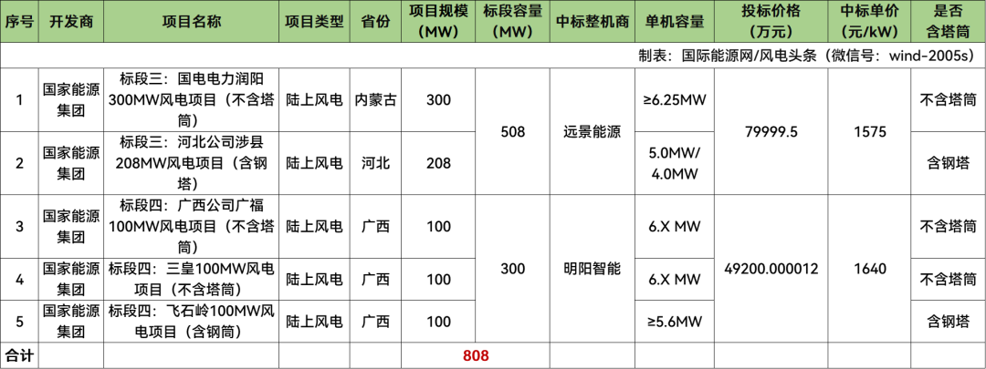 国家能源集团开标1463.1MW,明阳智能中标655.1MW,远景能源中标508MW,金风科技中标300MW。