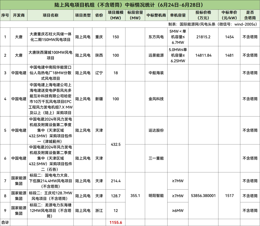 据统计,本周陆上风电不含塔筒项目共计9个,规模总计1155.6MW,项目中标均价为1484元/kW。