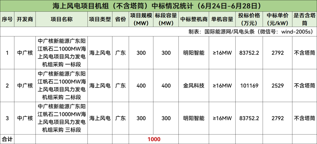 中广核开标1000MW,明阳智能中标600MW,金风科技中标400MW。