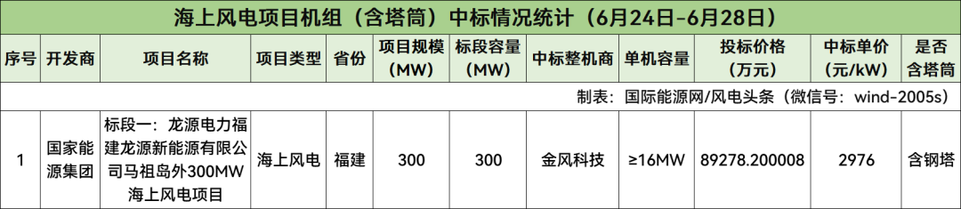 据统计,本周海上风电含塔筒项目共计1个,规模总计300MW,项目中标均价为2976元/kW。