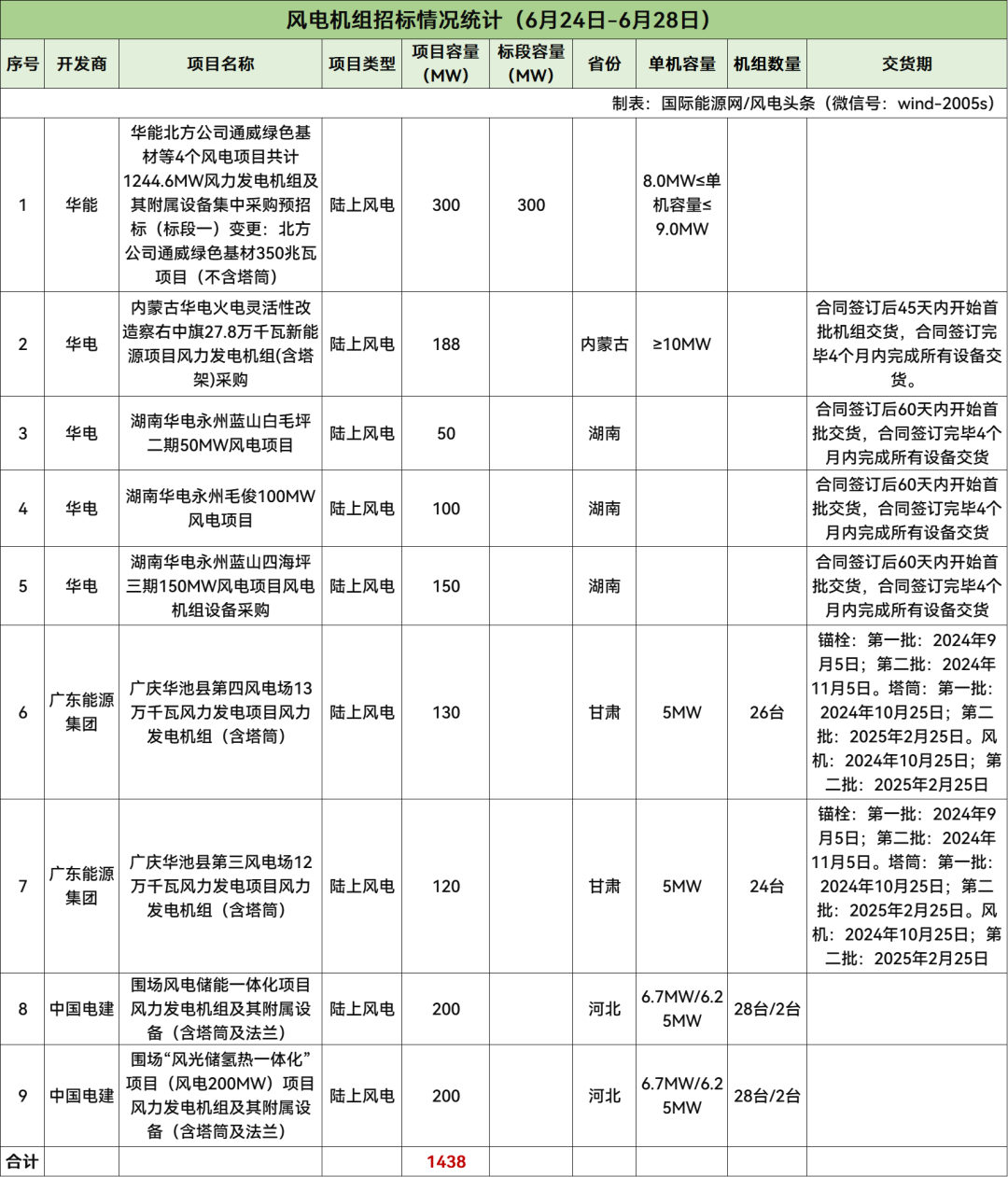 累计1438MW4家开发商风电机组招标