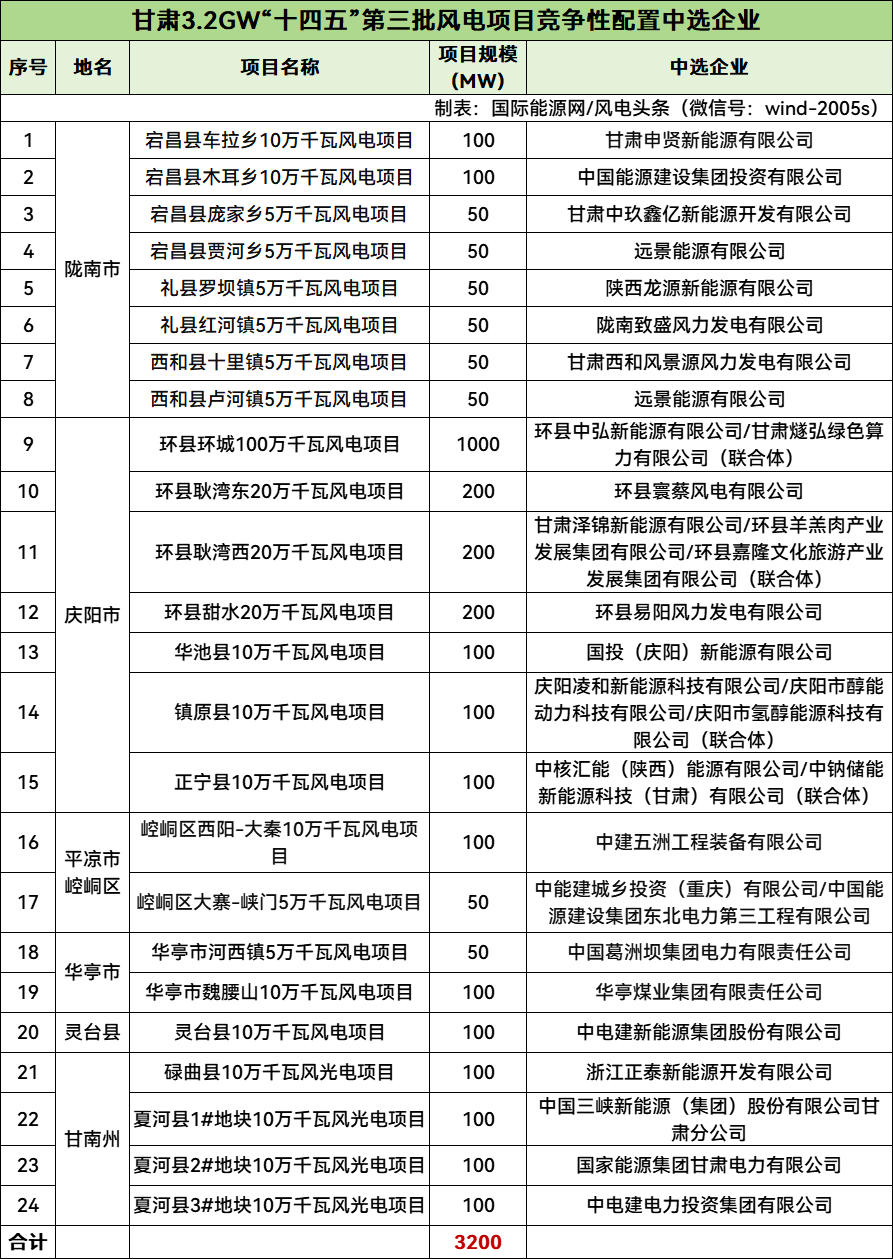 据还通过梳理,截至目前,陇南市、庆阳市、平凉市崆峒区、华亭市、灵台县、甘南州“十四五”第三批新能源项目竞争性配置中选企业公示,共计24个风电项目,规模总计3200MW。