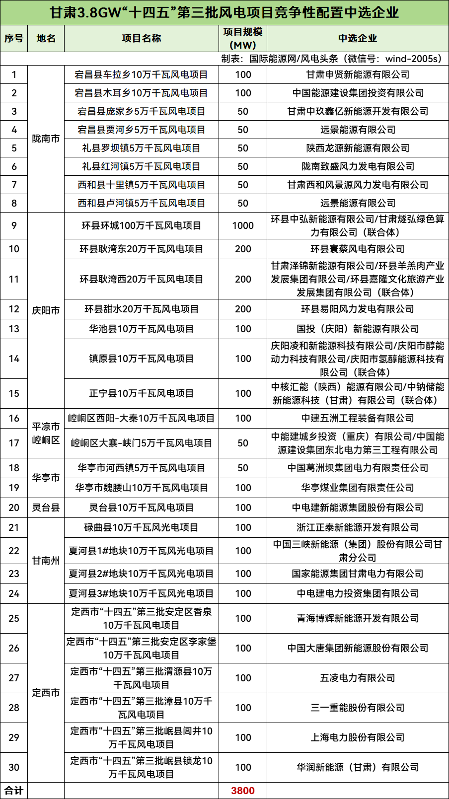据还通过梳理,截至目前,陇南市、庆阳市、平凉市崆峒区、华亭市、灵台县、甘南州、定西市“十四五”第三批新能源项目竞争性配置中选企业公示,共计30个风电项目,规模总计3800MW。
