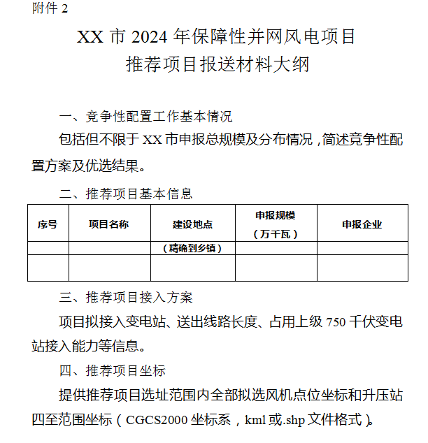 2. XX市2024年保障性并网风电项目推荐项目报送材料大纲