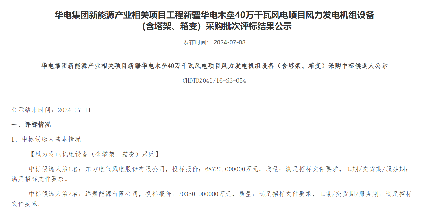 公告显示,第一中标候选人:东方电气风电股份有限公司,投标报价:68720.000000万元。第二中标候选人:远景能源有限公司,投标报价:70350.000000万元。