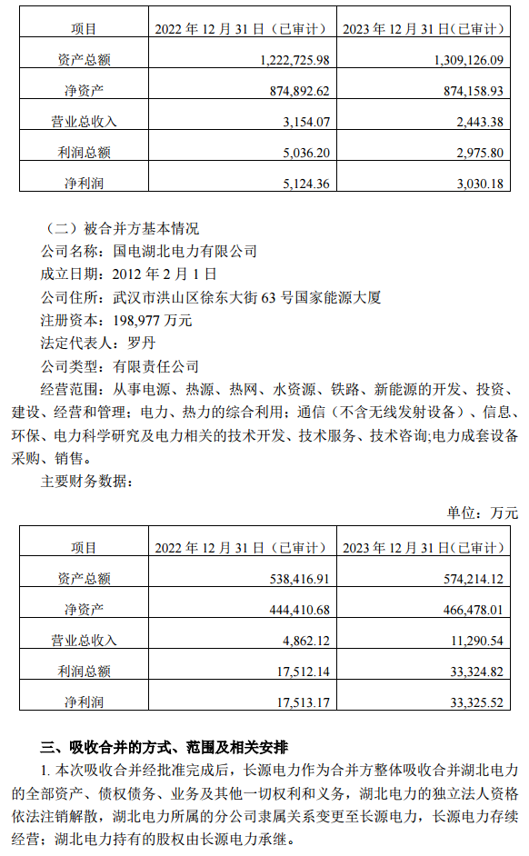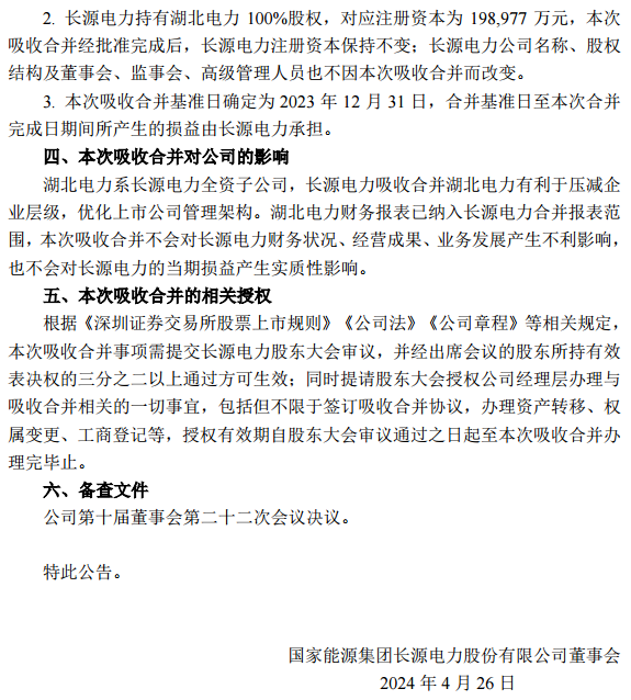 公告称,为压减企业层级,优化上市公司管理架构,提升管理效率,公司拟吸收合并全资子公司国电湖北电力有限公司(简称:湖北电力)。公司于2024年4月24日召开第十届董事会第二十二次会议审议通过了《关于吸收合并全资子公司的议案》,会议同意公司吸收合并全资子公司湖北电力。