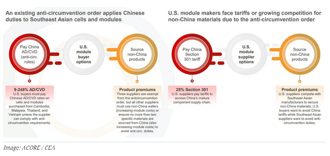从这四个东南亚国家进口的光伏组件占美国光伏组件总供应的近80%。而反倾销/反补贴关税通常占到光伏产品运输成本的50%至250%不等,这种关税风险给买家和供应商带来了很大的不确定性。美国清洁能源协会(CEA)和美国可再生能源委员会(ACORE)日前合作发布了一份评估这些风险的报告。