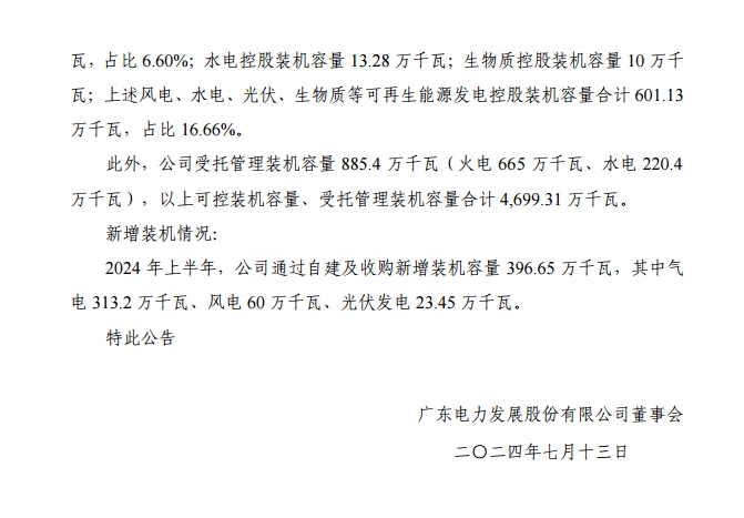 公告称,2024 年上半年,公司累计完成合并报表口径发电量 568.25 亿千瓦时,同比增加 0.53%;其中煤电完成 413.71 亿千瓦时,同比减少 7.88%,气电完成 112.65亿千瓦时,同比增加 31.45%,风电完成 27.02 亿千瓦时,同比增加 5.59%,水电完成 1.12 亿千瓦时,同比增加 14.29%,生物质完成 3.10 亿千瓦时,同比减少 8.55%,光伏完成 10.65 亿千瓦时,去年同期为 0.51 亿千瓦时。