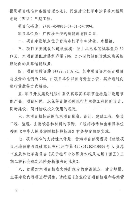 2024-04-30 7月18日,广西贵港市发改委发布关于桂平中沙罗秀木根风电场(西区)三期工程核准的批复。批复文件显示,桂平中沙罗秀木根风电场(西区)三期工程,项目单位为广西桂平浙远新能源有限公司,项目建设地点位于贵港市桂平市中沙镇、木根镇。