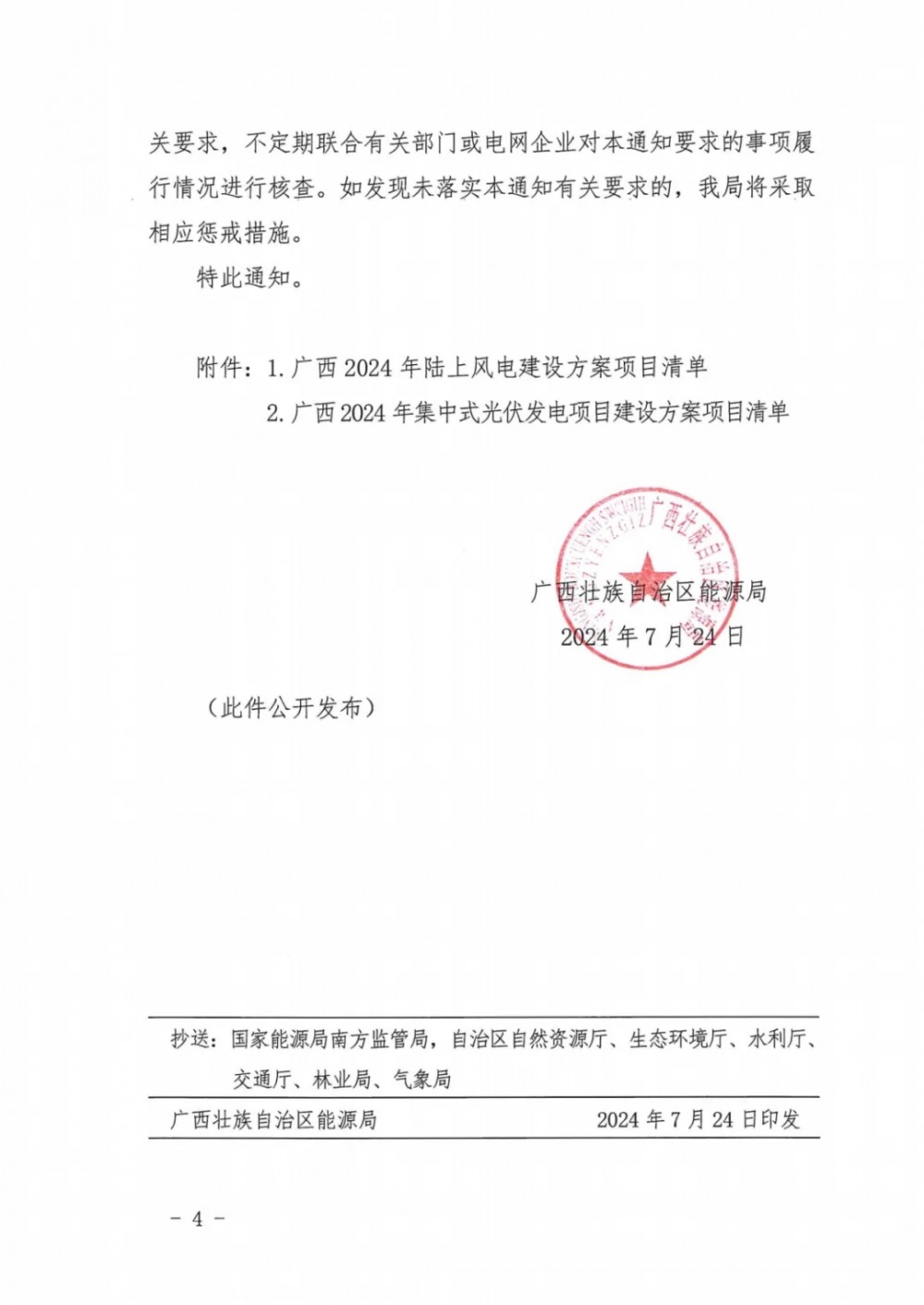 2024-04-30 7月24日,广西壮族自治区能源局发布《关于印发2024年度陆上风电、集中式光伏发电项目建设方案的通知》。