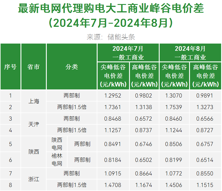 获悉,2024年8月电网代理购电价格中,全国峰谷价差最高的是上海,执行大工商业两部制1.5倍尖峰电价时,峰谷价差为1.7539元/kWh,比7月最高价格低0.0178元/kWh。