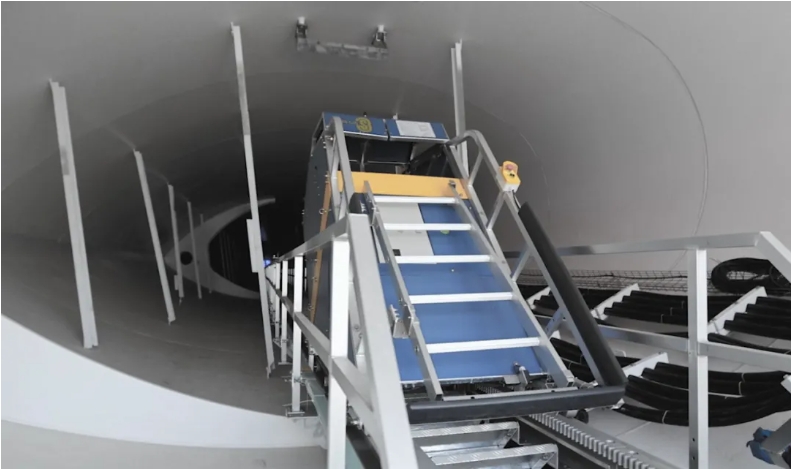 该漂浮式风机采用的是双45倾斜式塔筒,内部垂直高度及空间都非常有限,载物重量要求十分高,传统垂直升降设备无法满足其登塔需求。
