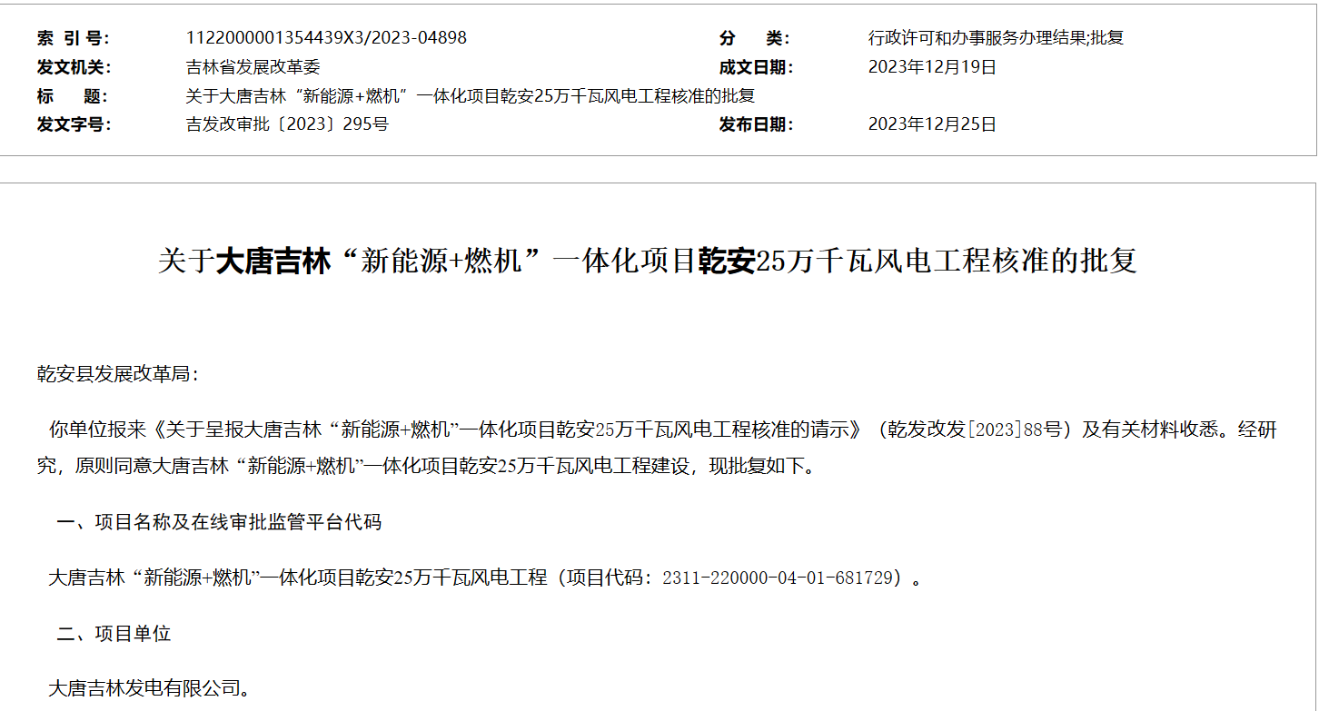 此前,大唐吉林新能源+燃机一体化项目乾安25万千瓦风电工程已于2023年12月19日获核准批复。