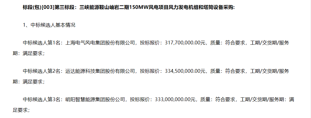 公告显示,第一中标候选人:上海电气风电集团股份有限公司,投标报价:317,700,000.00元。第三中标候选人:运达能源科技集团股份有限公司,投标报价:334,500,000.00元。第三中标候选人:明阳智慧能源集团股份公司,投标报价:333,000,000.00元。