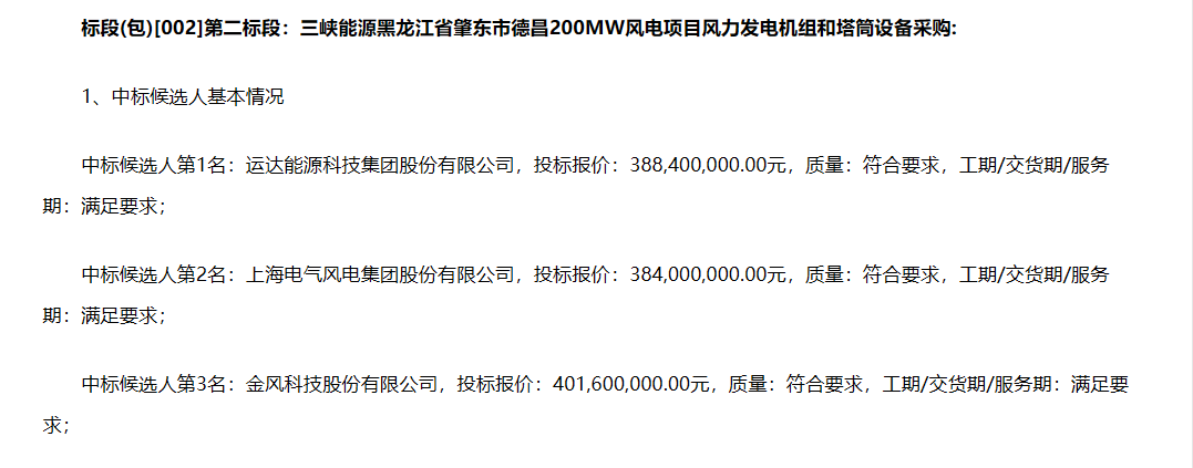 公告显示,第一中标候选人:运达能源科技集团股份有限公司,投标报价:389,200,000.00元。第二中标候选人:上海电气风电集团股份有限公司,投标报价:384,000,000.00元。第三标候选人:金风科技股份有限公司,投标报价:399,600,000.00元。