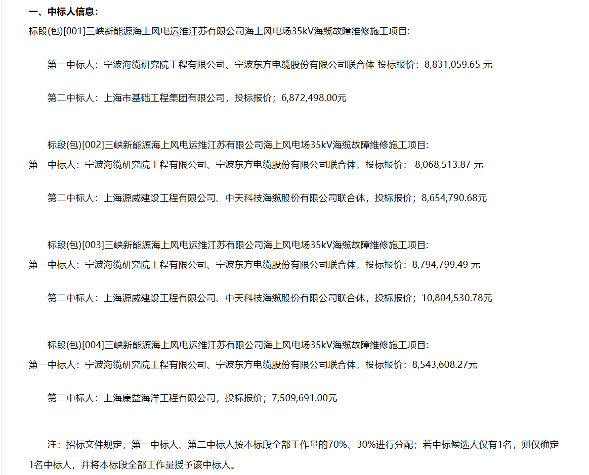 2024-04-30 7月30日,中国三峡电子采购平台发布《三峡新能源海上风电运维江苏有限公司海上风电场35kV海缆故障维修施工项目中标结果公告》。