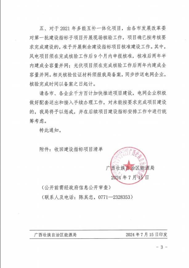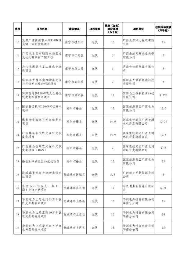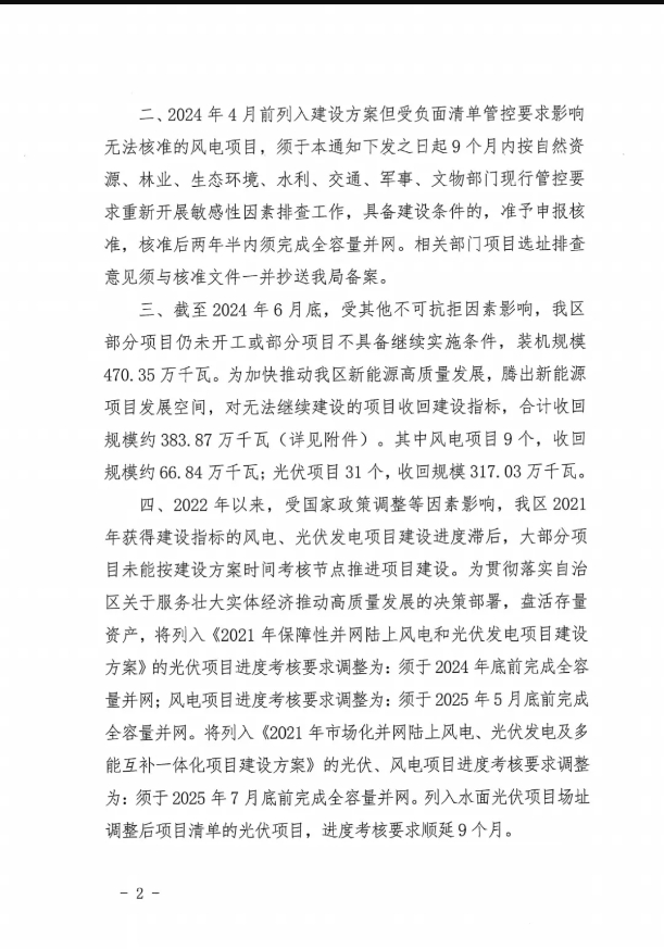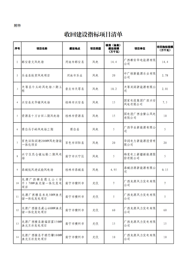 《通知》显示,截至2024年6月底,受其他不可抗拒因素影响,广西部分项目仍未开工或部分项目不具备继续实施条件,装机规模470.35万千瓦。为加快推动广西新能源高质量发展,腾出新能源项目发展空间,对无法继续建设的项目收回建设指标,合计收回规模约383.87万千瓦。其中风电项目9个,收回规模约66.84万千瓦;光伏项目31个,收回规模317.03万千瓦。