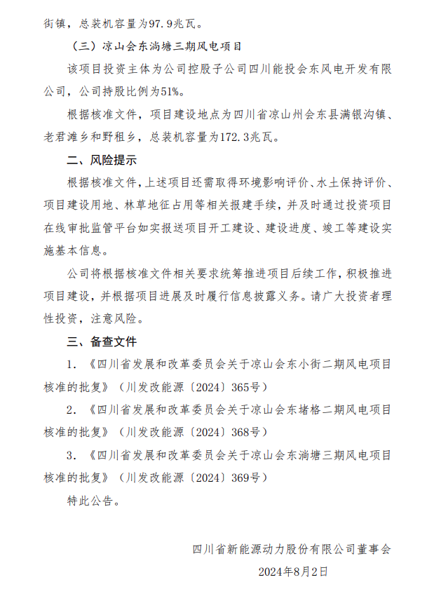 2024-04-30 8月2日,川能动力子公司四川能投会东风电开发有限公司收到四川省发改委相关批复文件,会东风电投资建设凉山会东小街二期风电项目、凉山会东堵格二期风电项目和凉山会东淌塘三期风电项目获核准。