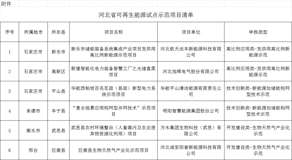 公示显示,河北省可再生能源试点示范项目共有6个,分别为新乐市储能装备系统集成产业项目发供用高比例新能源示范项目、新建智能化电力装备智慧工厂之光储直柔项目、华能西柏坡百兆瓦级(县级)新型电力系统示范项目、“复合场景应用构网型并网技术”示范项目、武邑县农村环境整治(人畜粪污及农业废弃物资源化利用)项目、巨鹿县生物天然气产业化示范项目。