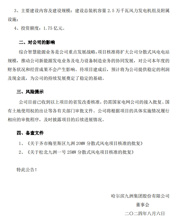 2024-04-30 近日,哈尔滨九洲集团股份有限公司(以下简称本公司或九洲集团)收到黑龙江省发展和改革委员会(以下简称省发改委)《关于齐市梅里斯区九洲 20MW分散式风电项目》(黑发改新能源【2024】544号)、《关于松北九洲一号25MW 分散式风电项目核准的批复》(黑发改新能源【2024】543号)。 省发改委对以上项目给予核准,主要批复内容如下: