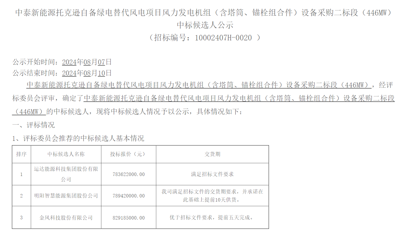 2024-04-30 8月7日,中泰集团招标投标网发布《中泰新能源托克逊自备绿电替代风电项目风力发电机组(含塔筒、锚栓组合件)设备采购一标段(704MW)中标候选人公示》的公告。