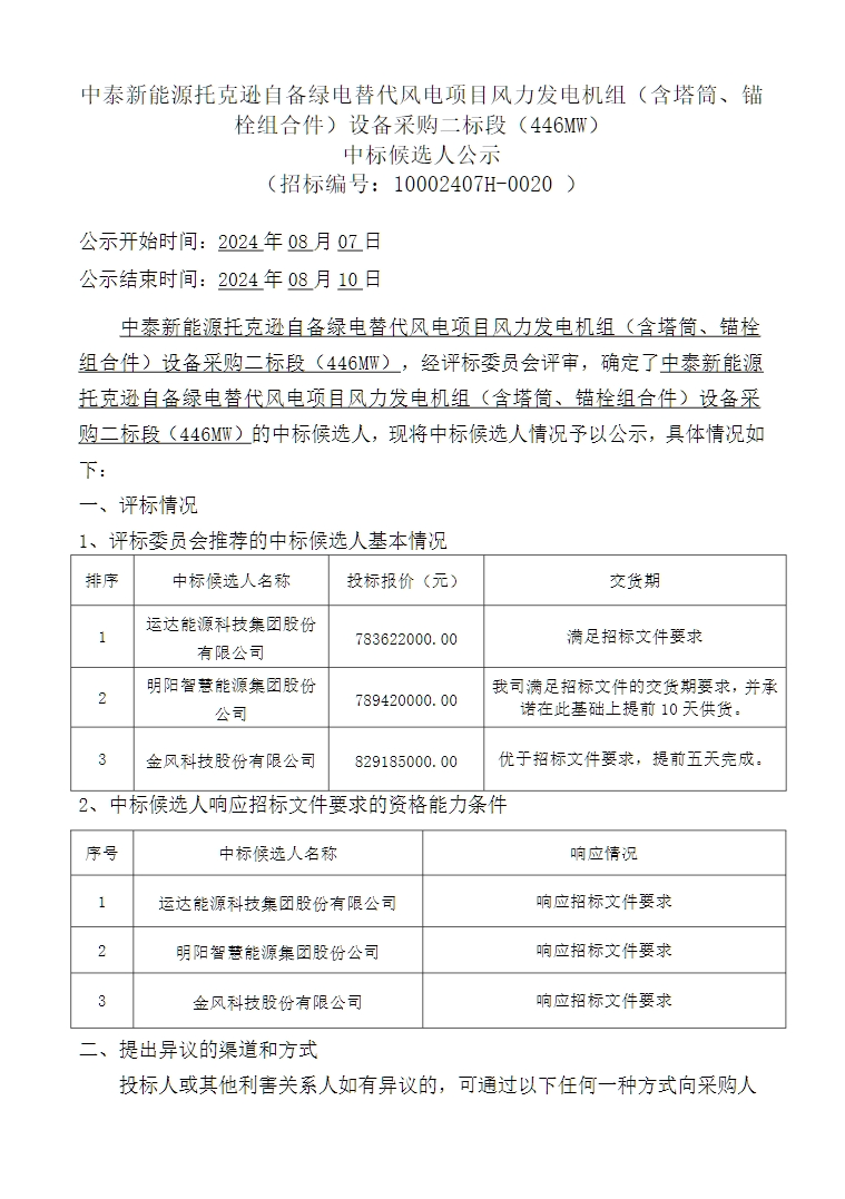 其中,中泰新能源托克逊自备绿电替代风电项目风力发电机组(含塔筒、锚栓组合件)设备采购一标段(704MW)经评标委员会评审,有效投标人不足3个且不具备竞争性,项目作废标处理。
